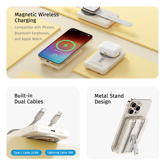 - Built-in 22.5w Type-C and 10w Lightning Cables.