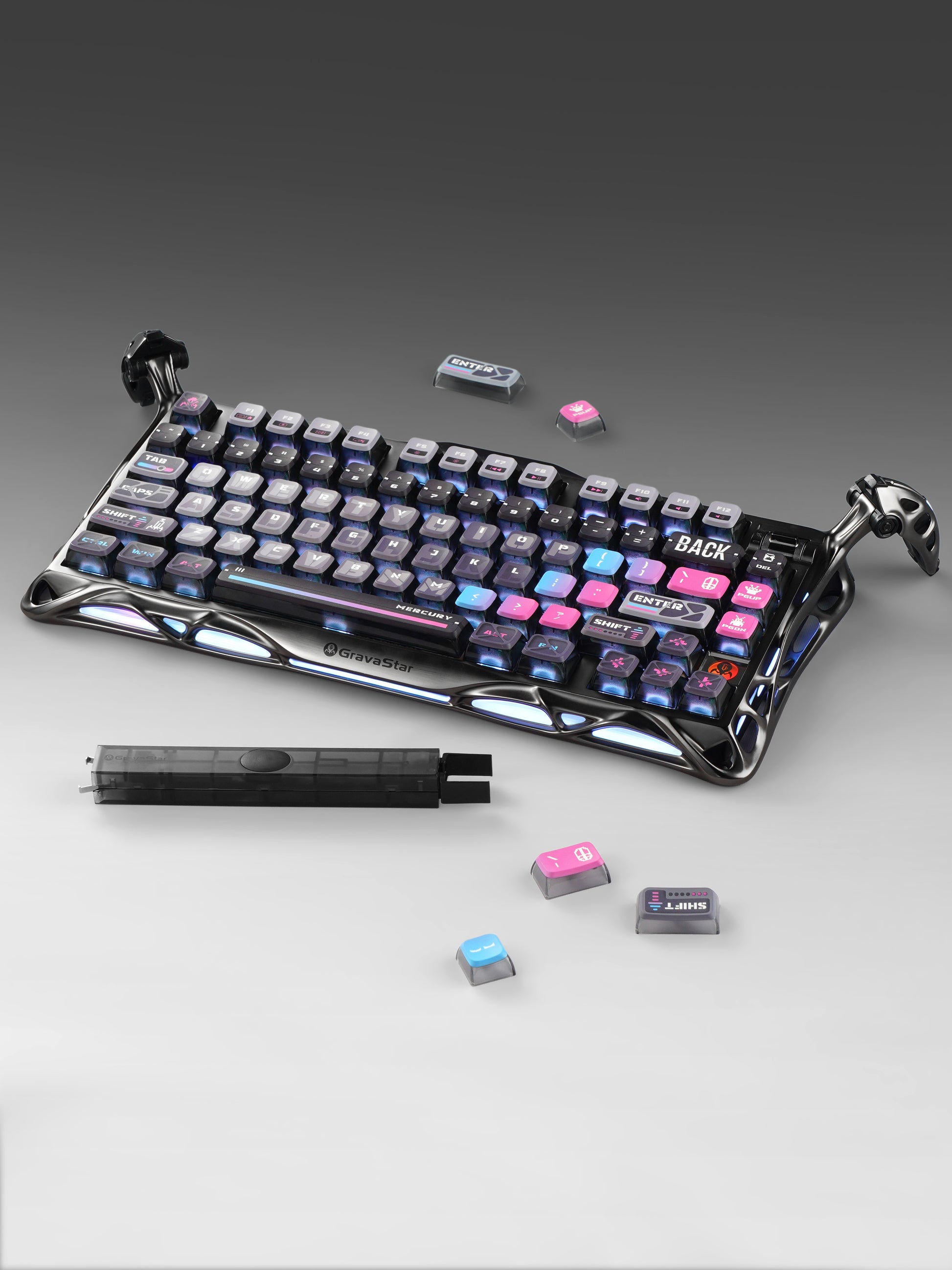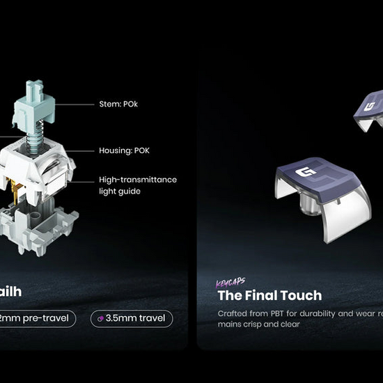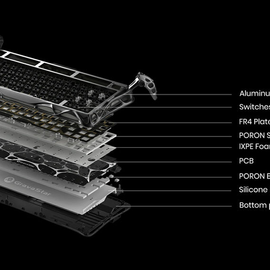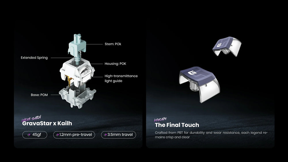- Switches: GravaStar x Kailh Speedy Mint Linear Switches;45gf actuation force, 1.2mm pre-travel, 3.5mm total travel