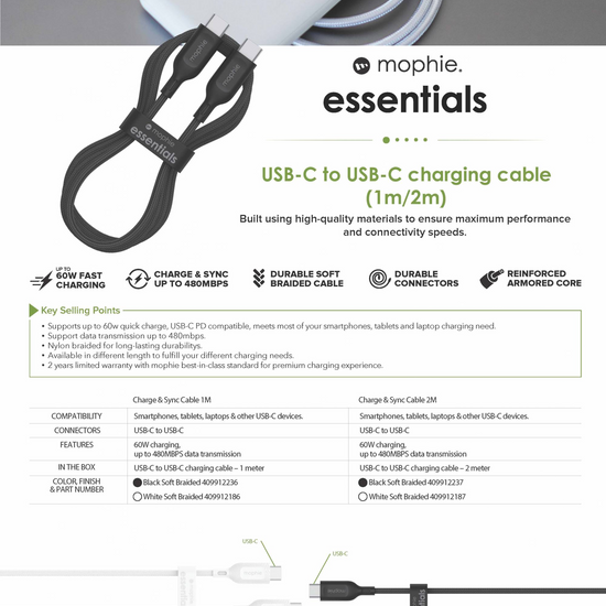MOPHIE Essential USB C to C Braided 60W Cable - 1M