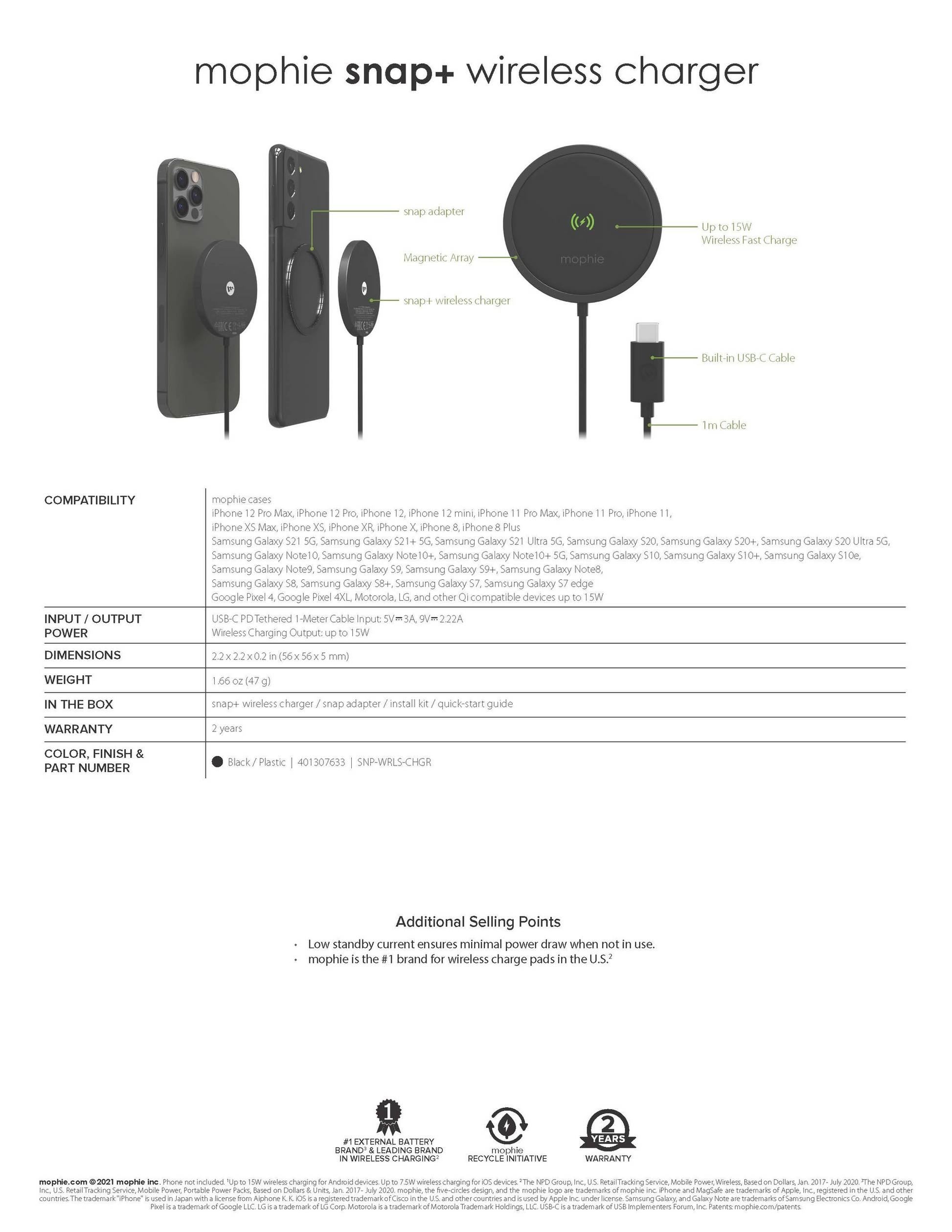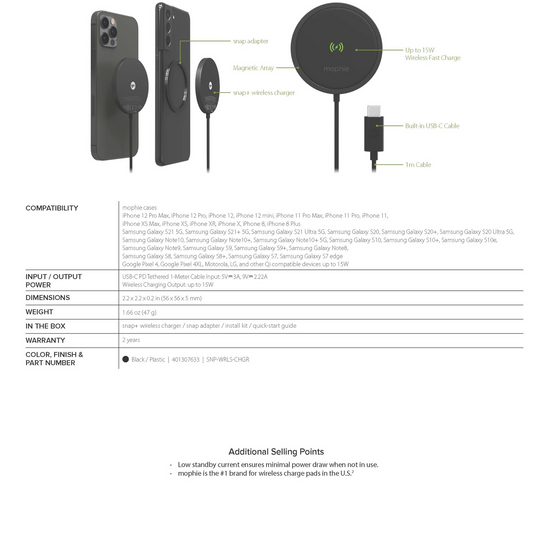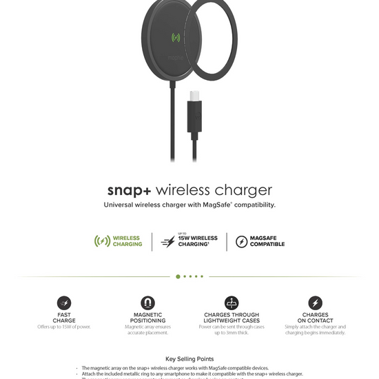 - The magnetic array on the snap+ wireless charger is compatible with M.Safe for iPhoneSeries 12 models and any Qi-enabled smartphone.